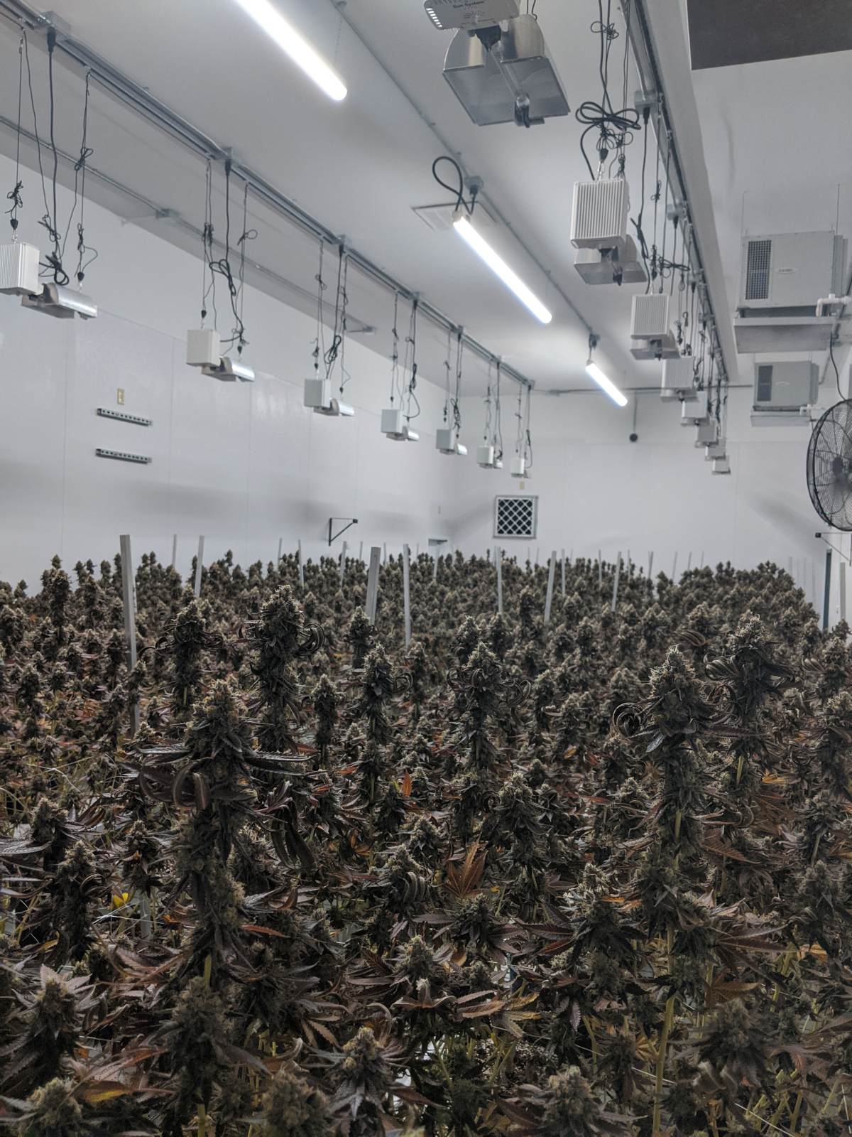 This is a picture I took in one of our flower rooms at work, at Mitten Canna CO. These rooms are around 20 feet wide and 48 feet long (around 6 meters wide by 14.6 meters long). The plants sit on short rolling tables, there are 3 tables per room. 18 DE HPS currently, hoping to upgrade to LED in the future.
