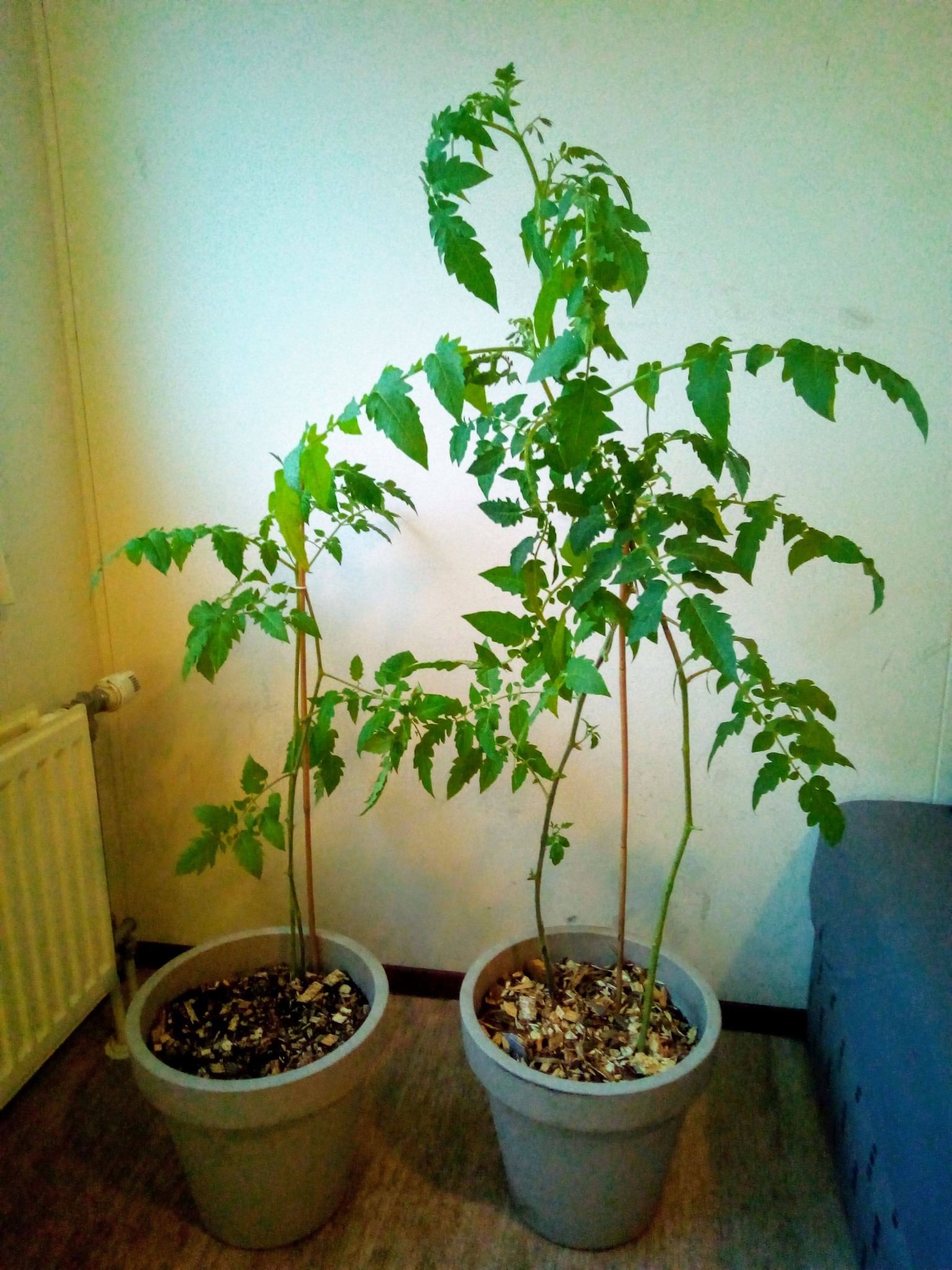 At this stage they were about 11 weeks old and I've put them in some soil with wood chip mulch and a couple of totally inappropriate bamboo canes for support.