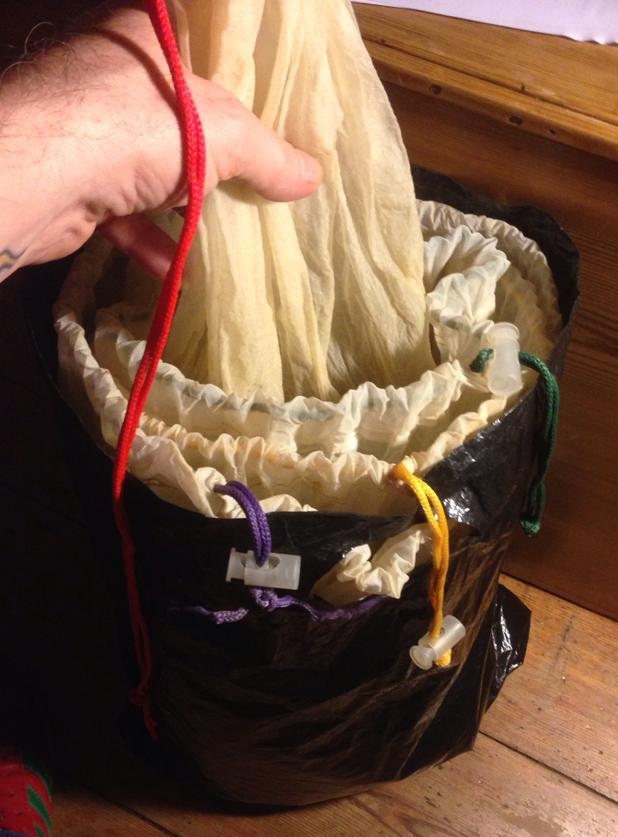using 4 bubble bags holding dry trim to collect trichomes, micron sizes 25 73 120, the red string bag holds the plant trim